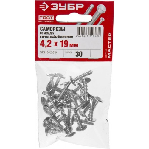 ЗУБР 19 х 4.2 мм, 30 шт., ПШМ-С саморезы с прессшайбой и сверлом для листового металла 300216-42-019 Мастер
