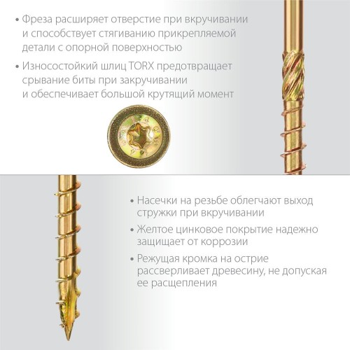Конструкционные саморезы ЗУБР 30051-80-200, применяется в строительстве для создания надежного и прочного крепления различных конструкций. Обладает высокой прочностью и пластичностью, благодаря чему не разрушаются при деформациях и изгибе. Тарельчатая головка увеличивает площадь повехности, предотвращая деформацию соединяемых элементов. Фреза расширяет отверстие при вкручивании и способствует стягиванию прикрепляемой детали с опорой поверхности. Износостойкий шлиц TORX предотвращает срывание биты при закручивании и обеспечивает большой крутящий момент. Насечки на резьбе облегчают выход стружки при вкручивании. Желтое цинковое покрытие надежно защищает от коррозии. Режущая кромка на острие рассверливает древесину, не допуская ее расщепления.