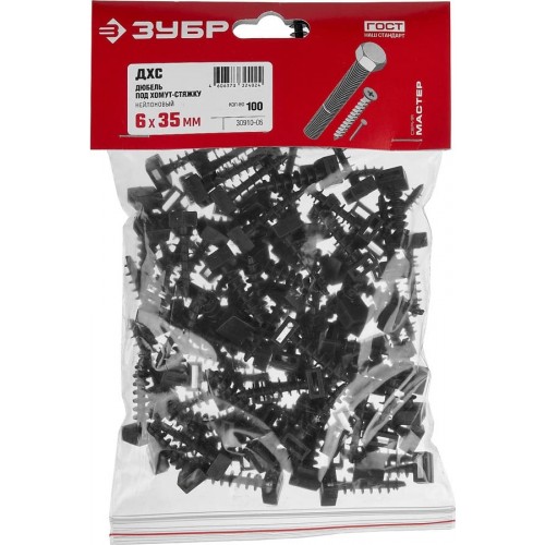 Дюбели ЗУБР 30910-06, предназначены для стяжки кабелей и проводов в пучки, а также крепления электропроводки к различным поверхностям. Стяжки, клипсы, дюбель-хомуты и монтажные площадки легко, быстро и удобно монтировать как внутри, так и вне помещений. Дюбели позволяют быстро и надежно прикрепить хомут (стяжку) для кабеля электропроводки к различным полнотелым основаниям. Изготовлены из прочного и эластичного нейлона.