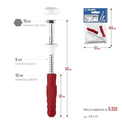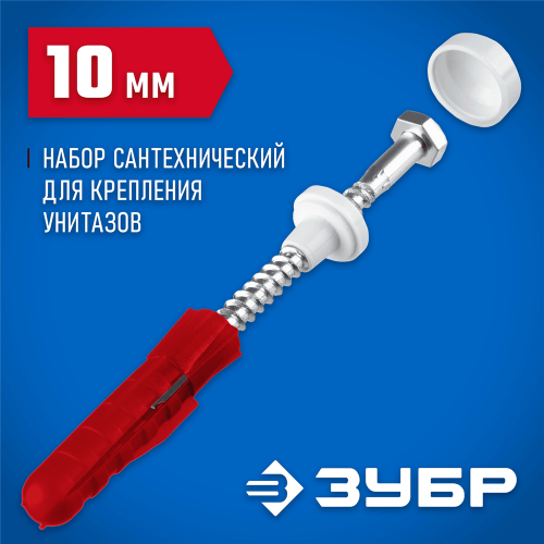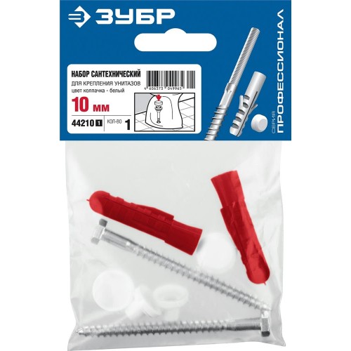 Набор для крепления унитазов ЗУБР 44210_z01, применяется для крепления унитазов к бетонному или кирпичному основанию. Диаметр предварительного сверления 10 мм. Набор включает в себя полный комплект крепежных изделий, необходимых для установки унитаза: дюбели, шурупы, декоративные колпачки и втулки пластмассовые. Декоративные колпачки белого цвета фиксируются на установленных шурупах и улучшают общий внешний вид.