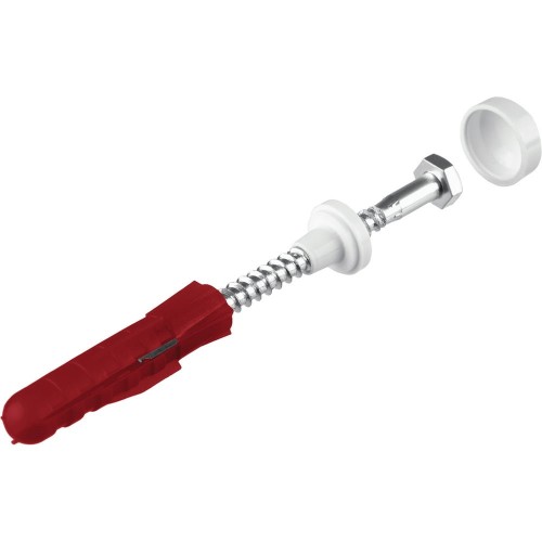 - Набор включает в себя полный комплект крепежных изделий, необходимых для установки унитаза: дюбели, шурупы, декоративные колпачки и втулки пластмассовые