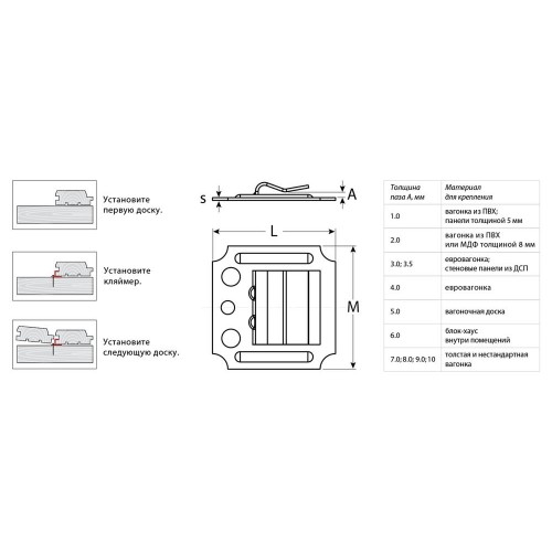 Для скрытого монтажа вагонки, ламинированных панелей, панелей МДФ. Особенности применения в зависимости от толщины паза: №1 – крепление вагонки из ПВХ и панелей толщиной 5 мм, №2 – крепление панелей толщиной 8 мм, изготовленных из ПВХ или МДФ, №3 и №3.5 – крепление евровагонки и стеновых панелей из ДСП, №4 – крепление евровагонки, №5 – крепление вагоночной доски, №6 – крепление блок-хауса внутри помещений, №7, 8, 9, 10 - крепление толстой и нестандартной вагонки,