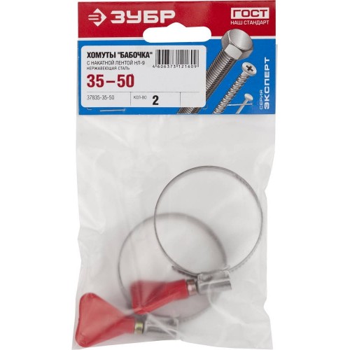 Хомут металлический ЗУБР 37835-35-50, предназначен для крепления шлангов к патрубкам, а также широко применяются в автомобилестроении, машиностроении, при выполнении авторемонтных, садовых, сантехнических и прочих работ. Хомут червячный состоит из накатной ленты и замка с пластиковым ключом. Пластиковый ключ обеспечивает возможность установки хомута без помощи инструментов. Накатная лента имеет гладкую внутреннюю поверхность, что обеспечивает высокую герметичность соединения без повреждения поверхности скрепляемых материалов. Изготовленный из нержавеющей стали хомут обладает повышенной прочностью и коррозионостойкостью. Червячный винт снабжен пластиковым ключом, что позволяет установить хомут без помощи инструментов. Хомут предназначен для многократного использования.