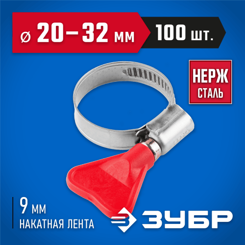 ЗУБР 100 шт., 20-32 мм, накатная лента 9 мм,"Бабочка" хомуты, 37835-20-32-100 Профессионал