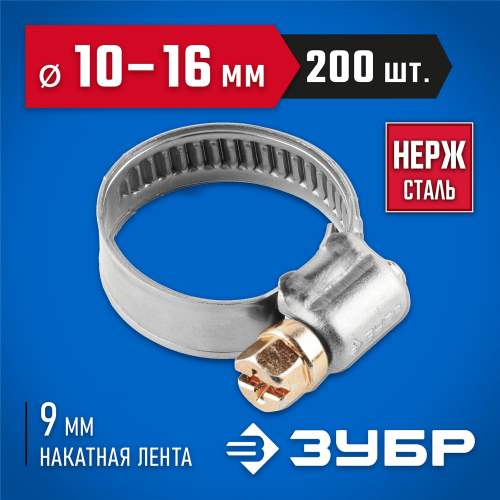 Хомут металлический ЗУБР 37820-10-16-200, для крепления шлангов к патрубкам, а также широко применяются в автомобилестроении, машиностроении, при выполнении авторемонтных, садовых, сантехнических и прочих работ. Хомут червячный состоит из накатной ленты и замка с винтом. Накатная лента имеет гладкую внутреннюю поверхность, что обеспечивает высокую герметичность соединения без повреждения поверхности скрепляемых материалов. Простота и удобство монтажа - для монтажа достаточно отвертки. Изготовленный из нержавеющей стали хомут обладает повышенной прочностью и коррозионостойкостью. Червячный винт снабжен шестигранной головкой и шлицем SL, что позволяет использовать при монтаже гаечный ключ или шлицевую отвертку. Хомут предназначен для многократного использования.