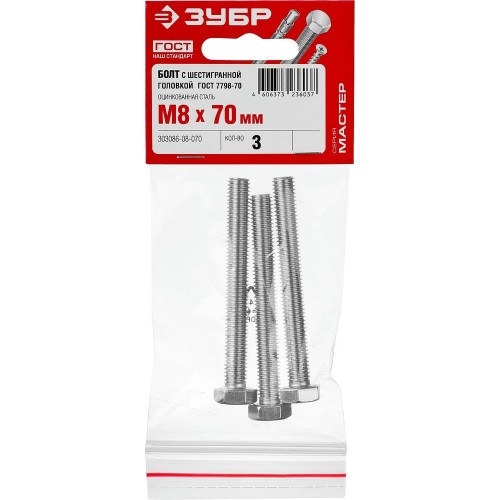 Болты ЗУБР 303086-08-070 изготовлены из высококачественной стали в полном соответствии с действующими стандартами и техническими предписаниями. Находят широкое применение в машиностроении, приборостроении, строительстве, быту и т.д. Шестигранная головка под ключ позволяет создать высокий крутящий момент при затягивании соединения. Класс прочности 5.8 обеспечивает необходимую жесткость конструкции. Цинковое покрытие надежно защищает от коррозии. Для создания разъемного резьбового соединения деталей и конструкций в строительстве и машиностроении. Используются совместно с гайками и шайбами.