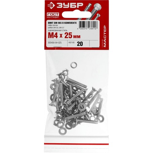 Набор метрического крепежа ЗУБР 303456-04-025, предназначен для создания разъемного резьбового соединения деталей и конструкций в строительстве и машиностроении. Изготовлен из высококачественной стали в полном соответствии с действующими стандартами и техническими предписаниями. Винты имеют потайную головку, что позволяет осуществить крепление заподлицо в мягком материале. Пружинные шайбы предотвращают раскручивание соединения. Плоские шайбы предназначены для увеличения площади соединения и распределения давления на опорную поверхность. Класс прочности 4.8 обеспечивает жесткость конструкции. Цинковое покрытие надежно защищает от коррозии.