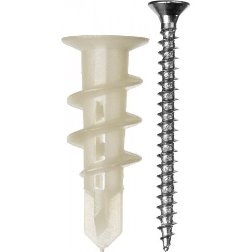 • Высокая резьба с крупным шагом увеличивает площадь контакта и фиксирует дюбель в гипсокартоне, не разрушая его.