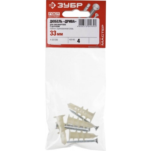 ЗУБР 33 мм, 4 шт., дюбели для гипсокартона с саморезами ДРИВА 4-301266
