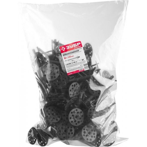Дюбели для теплоизоляции ЗУБР 4-301505-10-140_z01, предназначены для крепления теплоизоляционных материалов к полнотелым строительным материалам (бетону, кирпичу, природному камню). Дюбель вставляется в предварительно просверленное сквозное отверстие диаметром 10 мм, гвоздь забивается при помощи молотка. Большой диаметр головки дюбеля позволяет крепить как твердые, так и мягкие теплоизоляционные материалы (минеральную вату, стекловату, полистирол, пенопласт и др.), препятствуя их разрыву или повреждению в месте крепления. Пластиковый гвоздь обладает низкой теплопроводностью, что исключает появление "мостиков холода" и образование конденсата. Легкий и быстрый монтаж. Поперечные "зубцы" прочно удерживают установленный дюбель в отверстии, предотвращая его вырывание. Специальный ограничитель на конце дюбеля защищает от преждевременного распора при установке. Полипропилен устойчив к воздействию влаги, что позволяет использовать дюбели при выполнении наружных работ.