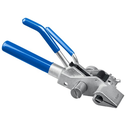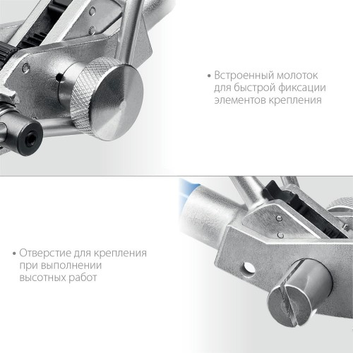 Инструмент 2в1 для затяжки стальных лент предназначен для быстрой и надёжной стяжки и обрезки. Ширина затягиваемых металлических лент до 20 мм. Цельнометаллический корпус с защитным покрытием. Усиленный нож для обрезки ленты.