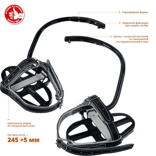 Когти монтерские ЗУБР 11590, предназначены для проведения ремонтно-монтажных работ. Крепежные ремни из натуральной кожи. Шипы с конусной заточкой выполнены из закаленной инструментальной стали. Обеспечивают надежную фиксацию при охвате столба.