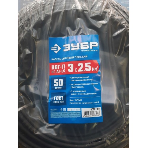 Кабель силовой ЗУБР 60007-50, предназначен для передачи и распределения электроэнергии в стационарных электротехнических установках, используется на разных уровнях без ограничения, в том числе на вертикальных участках. 100% чистая катодная медь. Однопроволочная токопроводящая жила. С пониженным дымо- и газовыделением, с низкой токсичностью продуктов горения. Плоское сечение кабеля требует меньше времени для монтажа. С пониженным дымо- и газовыделением. Соответствует требованиям ГОСТ 31996-2012. Срок службы кабеля более 30 лет.