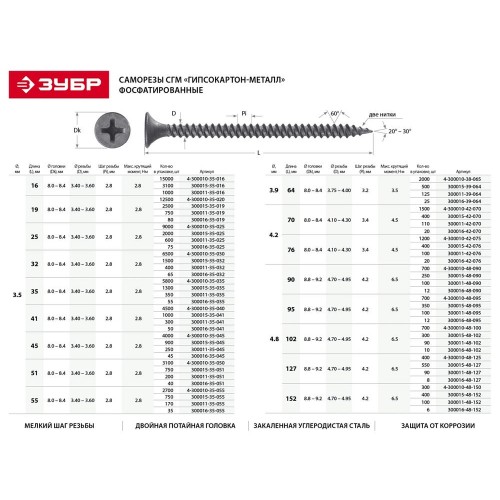 Саморезы гипсокартон-металл ЗУБР 300011-42-076, предназначены для крепления гипсокартона к металлическому профилю и твердым породам дерева. Фосфатированное покрытие обеспечивает защиту от коррозии. Саморезы для гипсокартона изготовлены из стального прутка с высоким содержанием углерода. Контроль за геометрией самореза начинается с калибровки прутка и заканчивается тщательной проверкой размеров готового изделия. Нормативная твердость стали достигается термической обработкой. Поверхностная твердость 550-720HV, твердость в сердцевине 290-450HV. Широко применяются при выполнении бытового ремонта, сборке и установке различных конструкций. Саморезы легко вкручиваются обычным шуруповертом или отверткой с крестообразным шлицем PH2 (DIN). Предварительное сверление в скрепляемых материалах не требуется.
