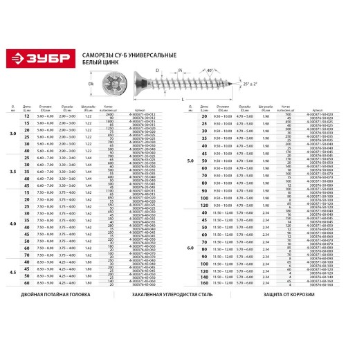 Саморезы универсальные ЗУБР 4-300377-40-050, предназначены для крепления деревянных конструкций и тонколистового металла. Саморезы универсальные изготовлены из стального прутка с высоким содержанием углерода. Нормативная твердость стали достигается термической обработкой. Саморезы легко вкручиваются обычным шуруповертом или отверткой.