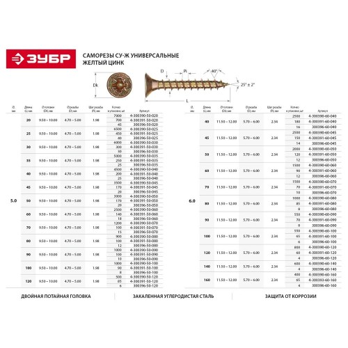 Саморезы универсальные ЗУБР 4-300391-50-090, предназначены для крепления различных материалов к деревянному основанию. Саморезы универсальные изготовлены из высококачественной стали, прошедшей термическую обработку. В отличие от шурупов, саморезы не требуют предварительного сверления в скрепляемых материалах. Находят широкое применение при выполнении бытового ремонта, сборке и установке различных конструкций. Двойная потайная головка утапливается в древесине, что придает конструкции более эстетический вид. Желтое цинковое покрытие обеспечивает надежную защиту от коррозии.
