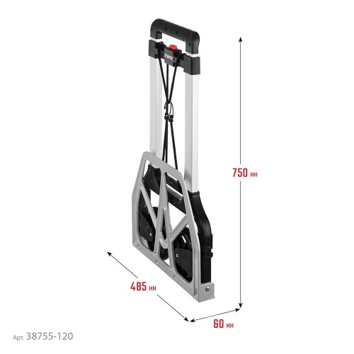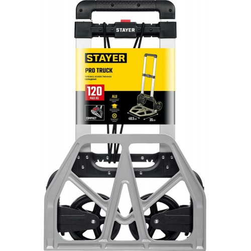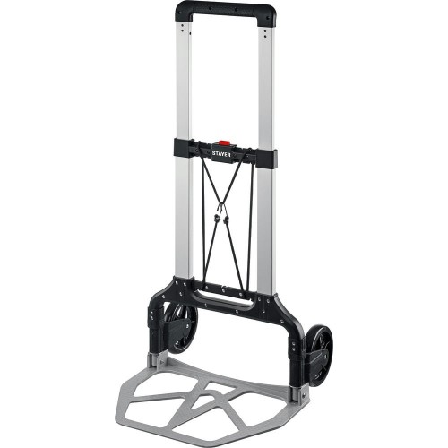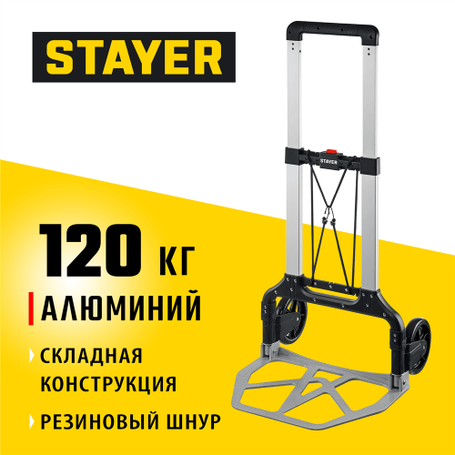 Тележка хозяйственная STAYER 38755-120, предназначена для транспортировки различных грузов, вес которых не превышает 120 кг. Складная конструкция обеспечивает комфортное хранение и транспортировку тележки в сложенном состоянии. Телескопическая рукоятка легко регулируется по высоте. Лёгкая и надёжная благодаря использованию современных материалов. Сложение/разложение за счёт одного движения ногой. Высокопрочный резиновый крепежный шнур, прилагающийся к тележке, позволяет надежно зафиксировать груз.