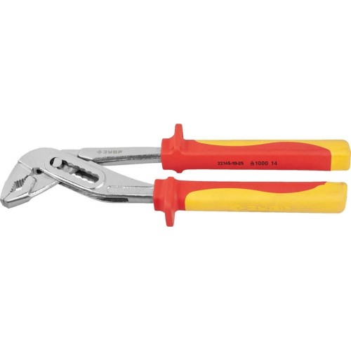 Клещи переставные диэлектрические ЗУБР 22145-10-25, предназначены для работ под напряжением до 1000 В и захвата и удерживания мелких предметов, перекусывания проволоки средней твердости и других слесарных и монтажных работах. Изготовлены из высококачественной инструментальной стали. Поверхность губок и режущие кромки дополнительно закалены токами высокой частоты для увеличения ресурса. Оптимальная геометрия рукояток и рабочих граней обеспечивает удобный захват, комфортную и эффективную работу. Хромированным покрытие для защиты от механических повреждений и предотвращения коррозии. Двухкомпонентные эргономичные диэлектрические рукоятки имеют защитные выступы, препятствующие контакту руки с объектом, находящимся под напряжением.