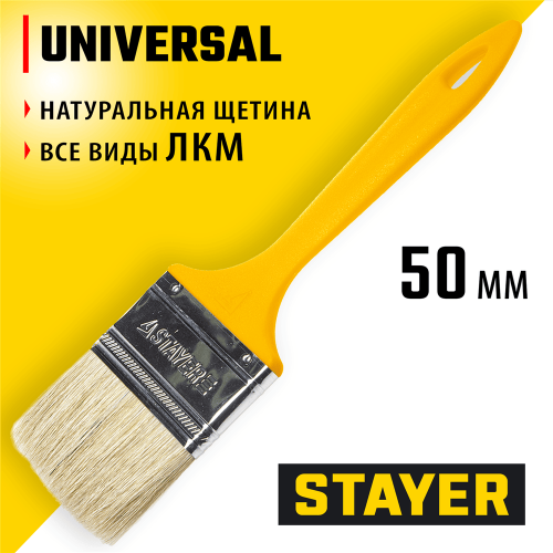 STAYER UNIVERSAL, 50 мм, 2", светлая натуральная щетина, пластмассовая ручка, все виды ЛКМ, плоская кисть (0107-50_z01)