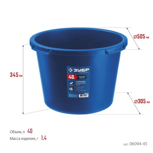 Таз строительный ЗУБР 06094-45, предназначен для приготовления и переноски строительных смесей. Подходит для приготовления любых видов строительных растворов (клеевых, штукатурных, лакокрасочных). Выполнен из высокопрочного морозостойкого пластика, устойчивого к химическому и механическому воздействиям. Имеет устойчивую конструкцию и 4 формованные ручки для удобного хвата и переноски.