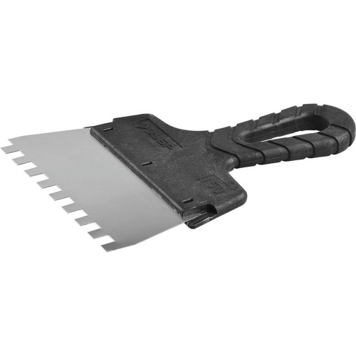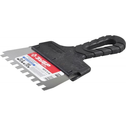 Благодаря зубчатой кромке шпатель идеально подходит для работы со строительными и клеевыми смесями, полотно из нержавеющей стали обеспечивает надежность и долгий срок службы инструмента, а удобная пластмассовая рукоятка создает условия для комфортной работы