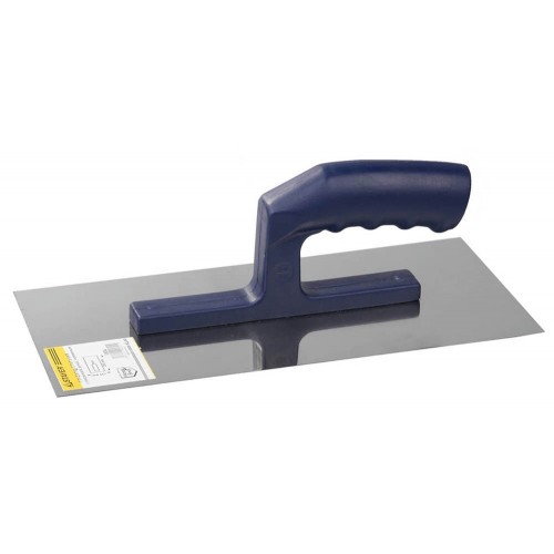 Зеркально отполированное нержавеющее полотно обеспечит надежность конструкции, лучшую защиту от коррозии, а удобная рукоять из ударопрочной пластмассы обеспечит комфортную работу при нанесении и распределении штукатурных смесей и клеевых составов.