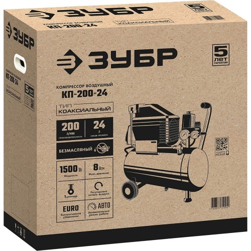 Компрессор воздушный ЗУБР КП-200-24, предназначен для накопления, хранения и подачи воздуха. Компактный и надежный безмасляный компрессор с поршневым типом пневматического механизма. Готов к работе сразу после покупки. Вырабатываемый воздух не содержит примесей масла, что не требует установки дорогостоящих маслоотделителей. Поршневой тип компрессора наиболее производителен среди другим типов. Не требует заправки маслом и контроля за наличием и его замены. Прямой привод упрощает конструкцию и увеличивает надежность. Выключатель давления обеспечивает автоматическое включение/выключение изделия при расходе сжатого воздуха. Сменный воздушный фильтр на входе защищает цилиндро-поршневую группу от абразивного износа. Быстросъемный штуцер обеспечивает удобное и быстрое подключение и отключение пневмоинструмента. Контроль давления в ресивере и на выходе при помощи двух манометров. Самовосстанавливающийся термопредохранитель. Регулировка давления на выходе.