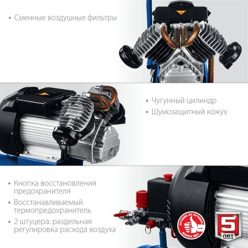 Компрессор воздушный ЗУБР КПМ-400-50, предназначен для накопления, хранения и подачи воздуха. Мощный компрессор с поршневым типом пневматического механизма и масляным типом смазки. Прямой привод упрощает конструкцию и увеличивает надежность. Мощные чугунные цилиндры и алюминиевая головка. Выключатель давления обеспечивает автоматическое включение/выключение изделия при расходе сжатого воздуха. Сменный воздушный фильтр на входе защищает цилиндро-поршневую группу от абразивного износа. Два типа для подключения рабочего инструмента делают изделие универсальным. Контроль давления в ресивере и на выходе при помощи двух манометров. Высокая производительность, возможность подключения двух инструментов, раздельная регулировка расхода воздуха через каждый позволяет подключать большой ассортимент пневмоинструмента. При правильной эксплуатации в соответствии с рекомендациями производителя ресурс данных компрессоров составит не менее 4000 часов*.* на основании результатов испытаний лаборатории компании АО «ЗУБР ОВК».