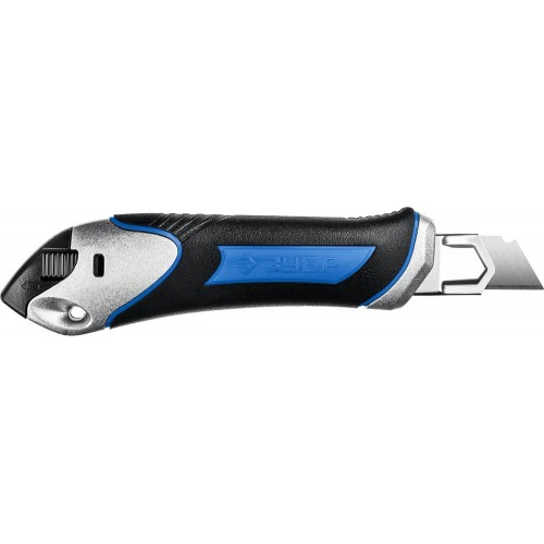 Нож с лезвием ЗУБР 09177_z02, применяется для эффективного разрезания различных материалов: линолеума, ковровых покрытий, гипсолитовых плит, гипсокартона, кровельных материалов, пластика, дерева. Прочный металлический корпус позволяет прикладывать значительные усилия при резе. Обрезиненный корпус обеспечивает крепкий и надежный захва. Автоматический фиксатор лезвия для удобства работы. Лезвие изготовлено из легированной стали У8А с двойной заточкой.