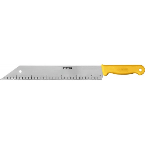 Нож для изоляционных материалов STAYER 09592, применяется для резки твердой пены, минеральной ваты и пенопласта. Лезвие ножа из нержавеющей стали. Зубчатая заточка лезвия. Длина лезвия позволяет быстро и ровно разрезать толстый слой теплоизоляции. Эргономичная пластиковая рукоятка.