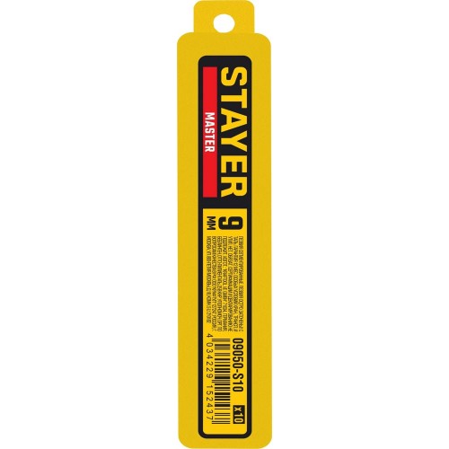 Лезвия сегментированные STANDARD STAYER 09050-S10, предназначены для материалов: линолеума, ковровых покрытий, гипсолитовых плит, гипсокартона, кровельных материалов, пластика, дерева, бумаги, картона, обоев и пленки. Обладают повышенным ресурсом, обеспечивают длительную и качественную работу. Лезвия изготовлены из высококачественной легированной стали 65Г, что увеличивает их срок службы. Двойная заточка сохраняет лезвие острым в течение длительного времени. Пластиковый футляр для безопасного хранения и быстрого извлечения лезвий.