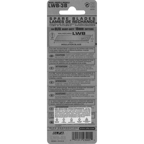 Лезвия OLFA OL-LWB-3B, используются в качестве сменных рабочих элементов в технических ножах соответствующего типа для разрезания различных материалов: линолеума, ковровых покрытий, гипсолитовых плит, гипсокартона, кровельных материалов, пластика, дерева.