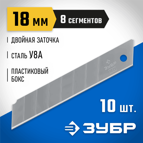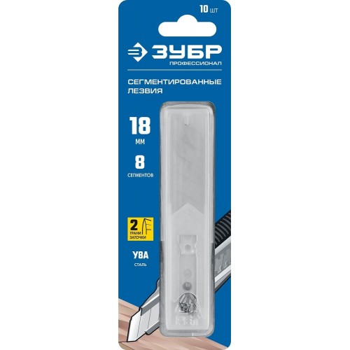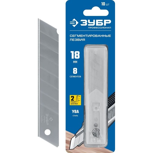 Лезвия сегментированные ЗУБР 09710-18-10, предназначены для реза различных материалов: бумаги, картона, обоев и пленки. Являются сменным рабочим элементом в ножах с шириной направляющей пластины 18 мм. Лезвия изготовлены из легированной стали У8А, что увеличивает срок их службы. Двойная заточка сохраняет лезвие острым в течении длительного времени. Пластиковый футляр для безопасного хранения и быстрого извлечения лезвий. Лезвия ЗУБР предназначены для профессионального применения. Обладают повышенным ресурсом, обеспечивают длительную и качественную работу.