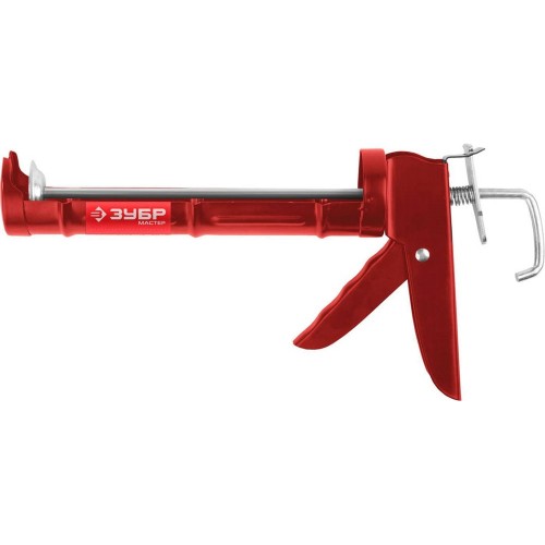 Пистолет для герметика ЗУБР 06621, подходит для работы с картриджами объемом 310 мл, имеет полуоткрытую конструкцию, крашенный стальной корпус и шток из оцинкованной стали.