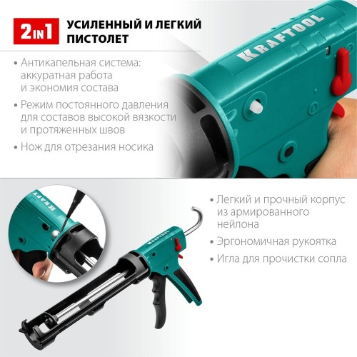 Пистолет для герметика KRAFTOOL 06674, предназначен для нанесения герметиков и клеевых составов из картриджей при проведении строительных, монтажных работ. Антикапельная система для аккуратной работы и экономии состава. Режим постоянного давления для составов высокой вязкости и протяженных швов. Легкий и прочный корпус из армированного нейлона. Игла для прочистки сопла. Нож для отрезания носика. Эргономичная рукоятка.