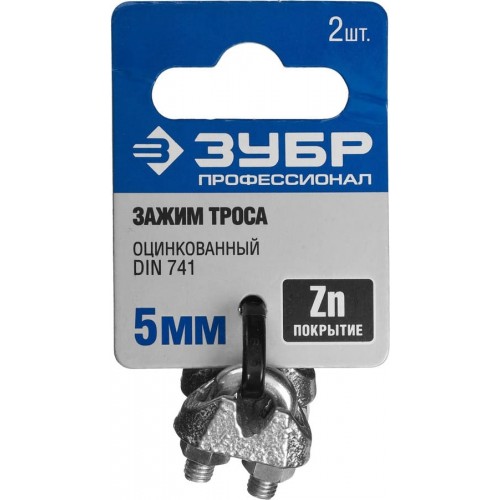 Зажимы ЗУБР 304416-05, предназначены для формирования петель на концах троса. Используются на тросах без оплетки ПВХ (если трос имеет оплетку, ее необходимо снять перед установкой зажима). Свободный конец троса закладывается в зажим (конец троса должен выходить из зажима на расстояние не менее 1/2 диаметра троса). Далее в петлю троса закладывается коуш, после которого трос помещается в зажим с другой стороны отверстия. Сверху помещается прижимная скоба, которую необходимо крепко зафиксировать с помощью гаек. Свободный конец троса рекомендуется обмотать изолентой для предотвращения разматывания троса после установки. Перед использованием необходимо убедиться, что гайки на зажимах закручены полностью. Рекомендуемое расстояние между зажимами равно шестикратному диаметру троса. Минимальное количество зажимов - 3 шт. Зажимы относятся к группе такелажного крепежа, предназначенного для закрепления и перемещения грузов с помощью тросов. Надежная фиксация петли троса. Цинковое покрытие обеспечивает защиту от коррозии.