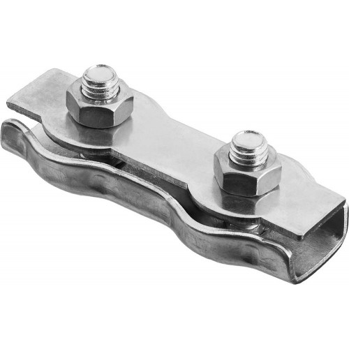 Зажимы ЗУБР 4-304445-04, предназначены для формирования петель на концах троса. Используются на тросах без оплетки ПВХ (если трос имеет оплетку, ее необходимо снять перед установкой зажима). Свободный конец троса закладывается в зажим (конец троса должен выходить из зажима на расстояние не менее 1/2 диаметра троса). Далее в петлю троса закладывается коуш, после которого трос помещается в зажим с другой стороны винта. Сверху помещается прижимная пластина, которую необходимо крепко зафиксировать с помощью гаек. Свободный конец троса рекомендуется обмотать изолентой для предотвращения разматывания троса после установки. Перед использованием необходимо убедиться, что гайки на зажимах закручены полностью. Зажимы относятся к группе такелажного (грузового) крепежа, предназначенного для закрепления и перемещения грузов с помощью тросов. Двойная фиксация петли троса. Цинковое покрытие обеспечивает защиту от коррозии.