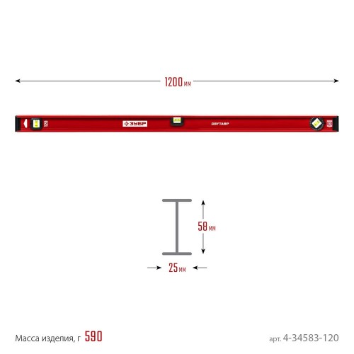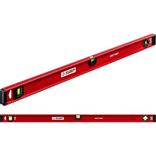 Уровень строительный ЗУБР 4-34583-120_z01, предназначен для контроля горизонтальности и вертикальности поверхностей. Точность измерений 1 мм/м. Фрезерованная базовая поверхность. 3 ударопрочные колбы. Поворотная колба на 360°.
