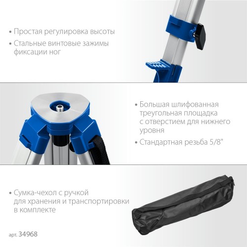 Профессиональный инструмент для работы с лазерным, оптическим, измерительным инструментом. Выполнен из алюминиевого сплава, благодаря чему имеет прочную конструкцию и оптимальный вес. Прибор можно точно установить на нужной высоте при помощи раздвижных ножек. Благодаря специальной конструкции ножек имеет