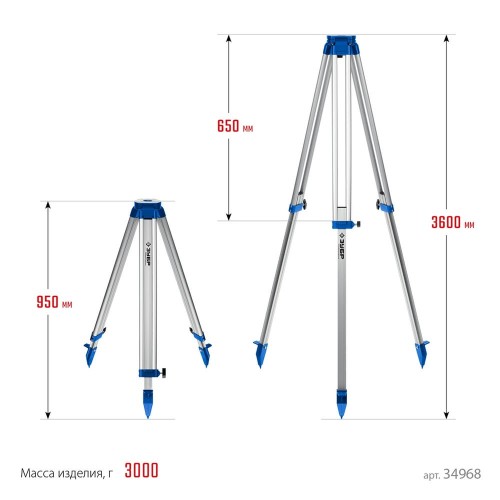 Штатив геодезический ЗУБР 34968, предназначен для работы с лазерным, оптическим и фотоинструментом. Выполнен из алюминиевого сплава, благодаря чему имеет прочную конструкцию и оптимальный вес. Прибор можно точно установить на нужной высоте при помощи раздвижных ножек.
