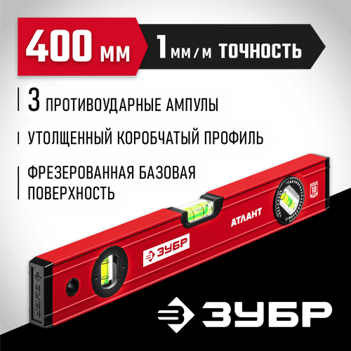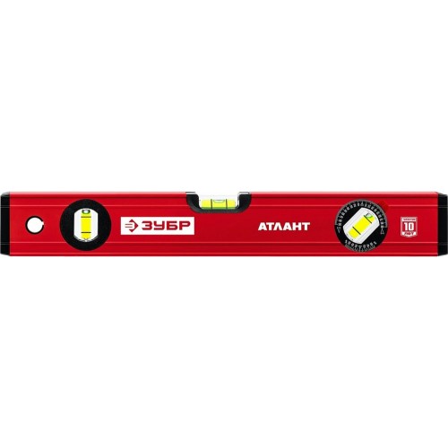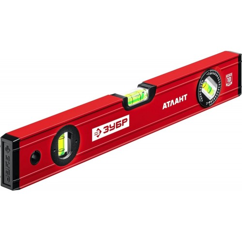 Уровень строительный ЗУБР 34585-040_z01, предназначен для контроля горизонтальности и вертикальности поверхностей. Усиленный профиль для повышения прочности конструкции. 3 ударопрочные колбы.