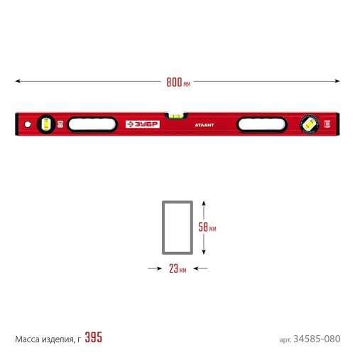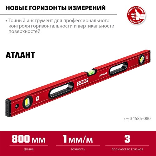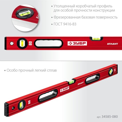 Уровень строительный ЗУБР 34585-080_z01, предназначен для контроля горизонтальности и вертикальности поверхностей. Усиленный профиль для повышения прочности конструкции. 3 ударопрочные колбы. Рукоятки повышают удобство измерений.