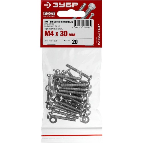 Набор метрического крепежа ЗУБР 303476-04-030, предназначен для создания разъемного резьбового соединения деталей и конструкций в строительстве и машиностроении. Изготовлен из высококачественной стали в полном соответствии с действующими стандартами и техническими предписаниями. Винты имеют потайную головку, что позволяет осуществить крепление заподлицо в мягком материале. Пружинные шайбы предотвращают раскручивание соединения. Плоские шайбы предназначены для увеличения площади соединения и распределения давления на опорную поверхность. Класс прочности 4.8 обеспечивает жесткость конструкции. Цинковое покрытие надежно защищает от коррозии.