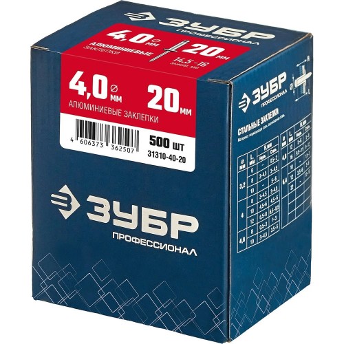 ЗУБР 4.0 х 20 мм, 500 шт., алюминиевые заклепки 31310-40-20 Профессионал
