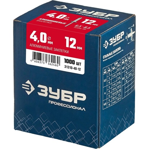 ЗУБР 4.0 х 12 мм, 1000 шт., алюминиевые заклепки 31310-40-12 Профессионал