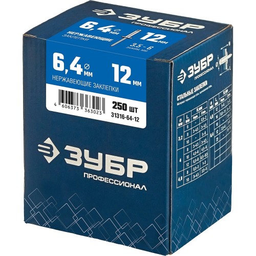 Заклепки из нержавеющей стали ЗУБР 31316-64-12, предназначены для получения неразъемного соединения из двух или более слоев материалов с помощью заклепочника. Нержавеющая сталь обладает высокой коррозионостойкостью и долговечностью. Повышенная прочность соединения и устойчивость к большим нагрузкам. Конструкция бортика обеспечивает герметичность соединения.