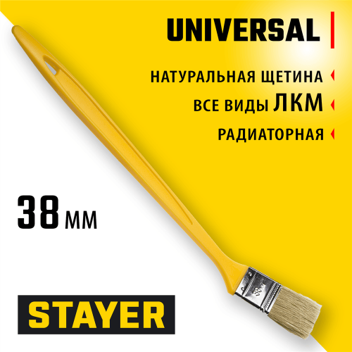 Кисть радиаторная STAYER 0110-38_z01, предназначен для нанесения любых лакокрасочных материалов в местах, где трудно это сделать обычной кистью. Удлиненная рукоятка и расположение головки кисти под углом обеспечивают качественное нанесение покрытия в труднодоступных местах.