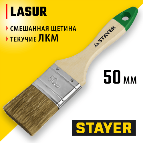 STAYER LASUR, 50 мм, 2", смешанная щетина, деревянная ручка, для высокотекучих ЛКМ, плоская кисть (01031-50)