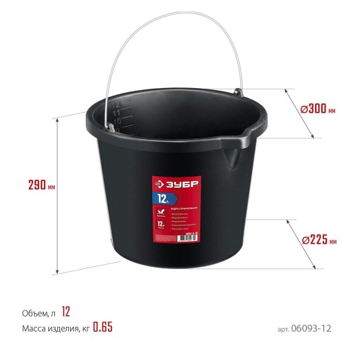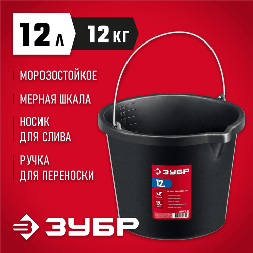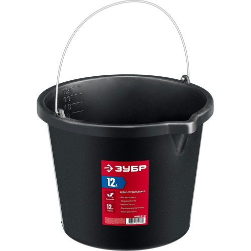 Ведро строительное с носиком ЗУБР 06093-12_z03, предназначено для приготовления и переноски строительных смесей. Строительное ведро подходит для приготовления и переноски любых видов строительных и малярных смесей. Изготовлено из высокопрочной пластмассы, устойчивой к химическому и механическому воздействию. Имеет оцинкованную рукоятку, удобный носик для слива и мерную шкалу, позволяющую с точностью соблюдать дозировку при приготовлении смесей.