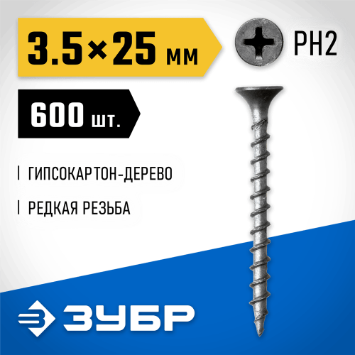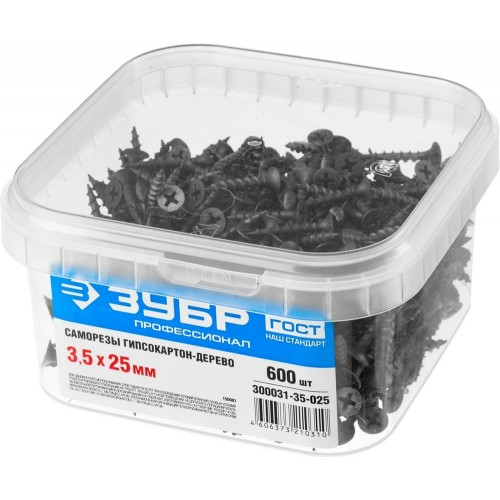 Саморезы гипсокартон-дерево ЗУБР 300031-35-025, предназначены для крепления гипсокартона к деревянной обрешетке, не допуская крошение волокнистой структуры дерева. Саморезы легко вкручиваются обычным шуруповертом или отверткой с крестообразным шлицем PH2 (DIN). Предварительное сверление в скрепляемых материалах не требуется. Фосфатированное покрытие обеспечивает защиту от коррозии. Широко применяются при выполнении бытового ремонта, сборке и установке различных конструкций. Саморезы для гипсокартона изготовлены из стального прутка с высоким содержанием углерода. Контроль геометрии самореза начинается с калибровки прутка и заканчивается тщательной проверкой размеров готового изделия. Нормативная твердость стали достигается термической обработкой. Поверхностная твердость 450-720HV, твердость в сердцевине 290-450HV.